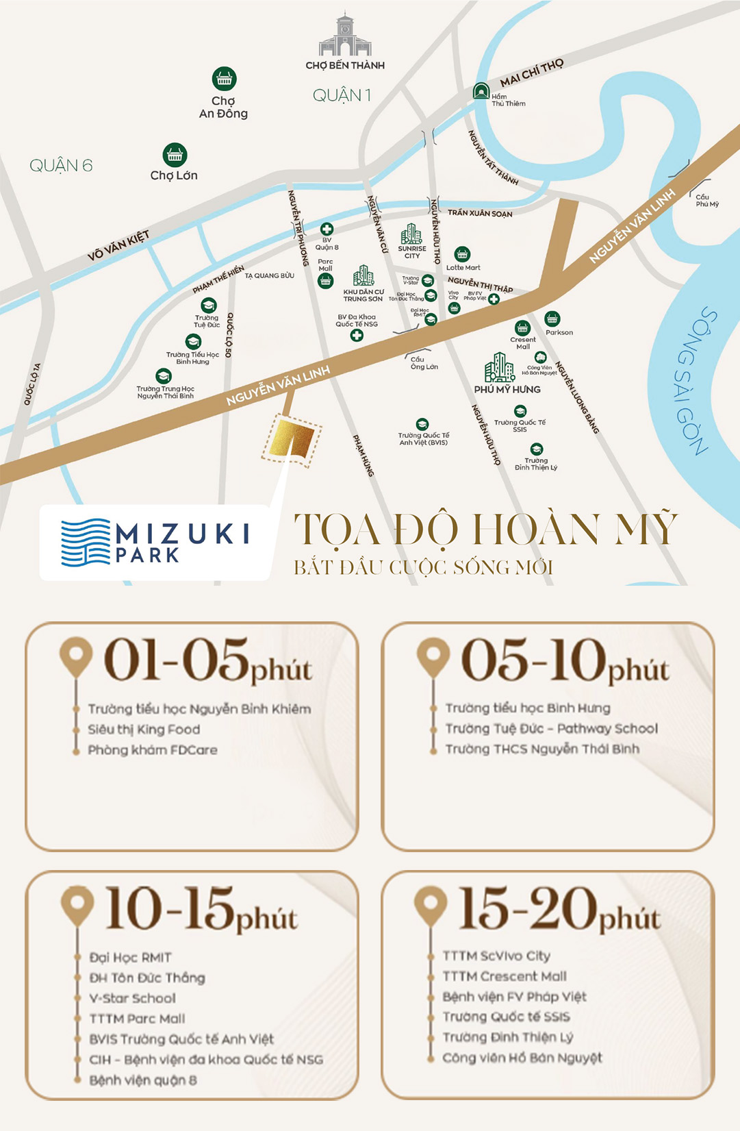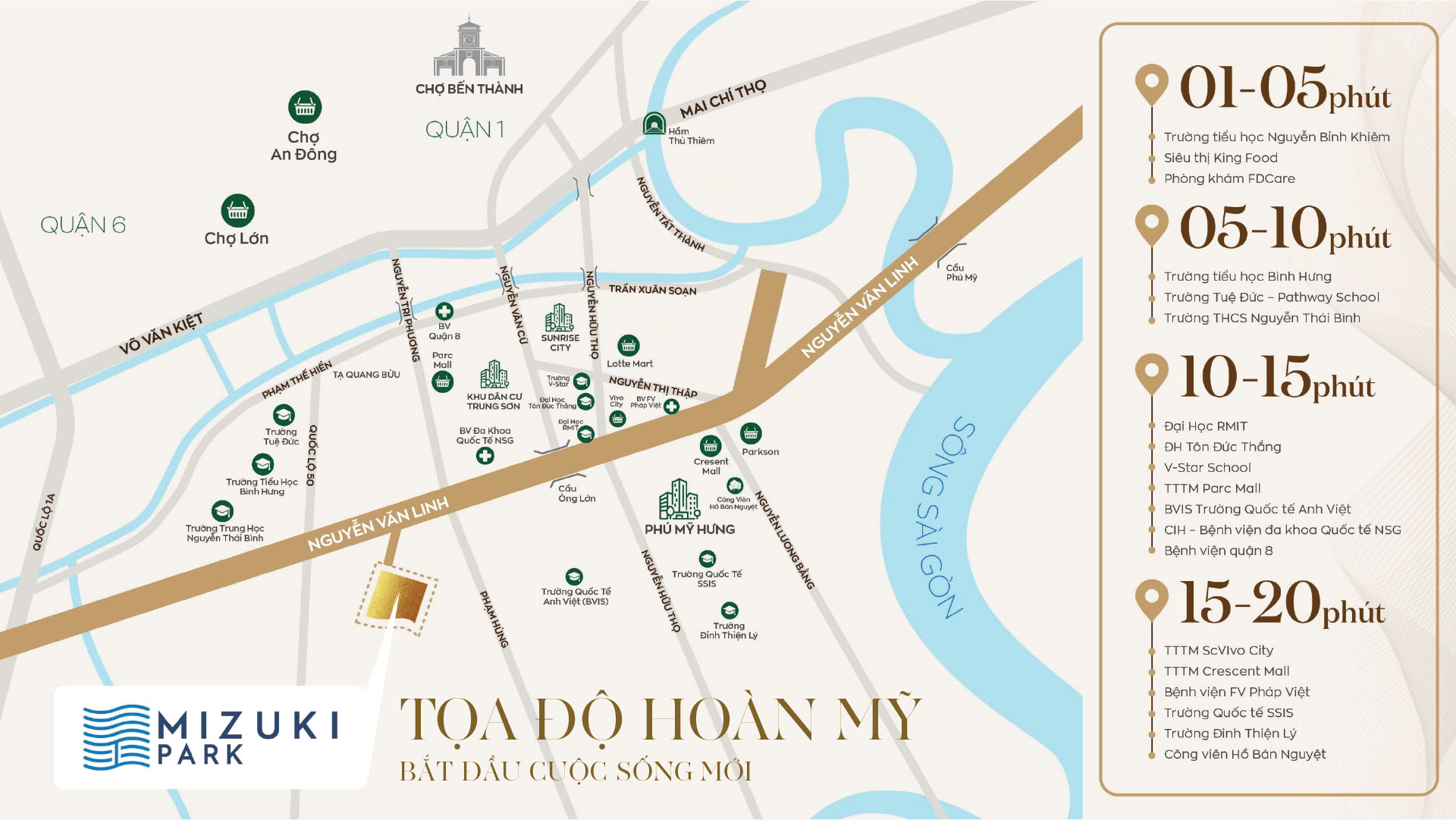 Tọa lạc tại khu Nam Sài Gòn, ngay trục đường “xương sống” Nguyễn Văn Linh và liền kề Phú Mỹ Hưng, Mizuki Park là một trong số ít khu đô thị quy mô lớn, sở hữu hệ thống tiện ích đồng bộ, môi trường sống chất lượng và cộng đồng dân cư văn minh, hiện đại.